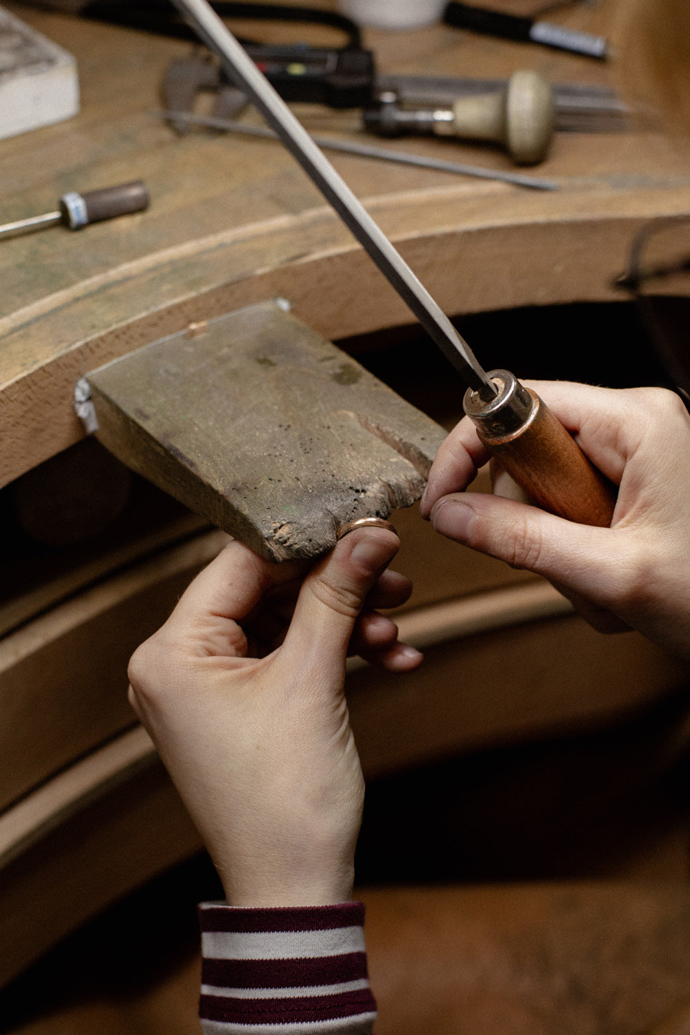 Elle réalise à main levée les esquisses de ses pièces et maîtrise l’ensemble des étapes de fabrication, de la conception, en passant par la réalisation des maquettes cire et métal, jusqu’à la livraison du bijou fini.